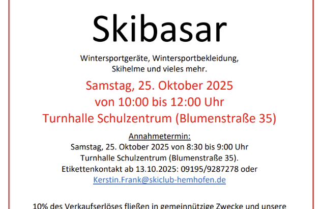 Wintersportgeräte, Wintersportbekleidung, Skihelme und vieles mehr. Samstag, 25. Oktober 2025 von 10:00 bis 12:00 Uhr Turnhalle Schulzentrum (Blumenstraße 35) Annahmetermin: Samstag, 25. Oktober 2025 von 8:30 bis 9:00 Uhr Turnhalle Schulzentrum (Blumenstraße 35). Etikettenkontakt ab 14.10.2025: 09195/9287278 oder Kerstin.Frank@skiclub-hemhofen.de 10% des Verkaufserlöses fließen in gemeinnützige Zwecke und unsere Jugendarbeit. Durch die Zusammenarbeit mit unseren Partner Sport – Kempe gibt es…